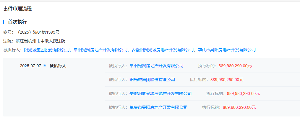 【大河财立方消息】7月8日,据天眼查App,近日,阳光城集团股份有限公司、阜阳光聚房地产开发有限公司、安徽阳聚光城房地产开发有限公司、肇庆市昊阳房地产开发有限公司新增一条被执行人信息,执行标的8.89亿余元,执行法院为浙江省杭州市中级人民法院。