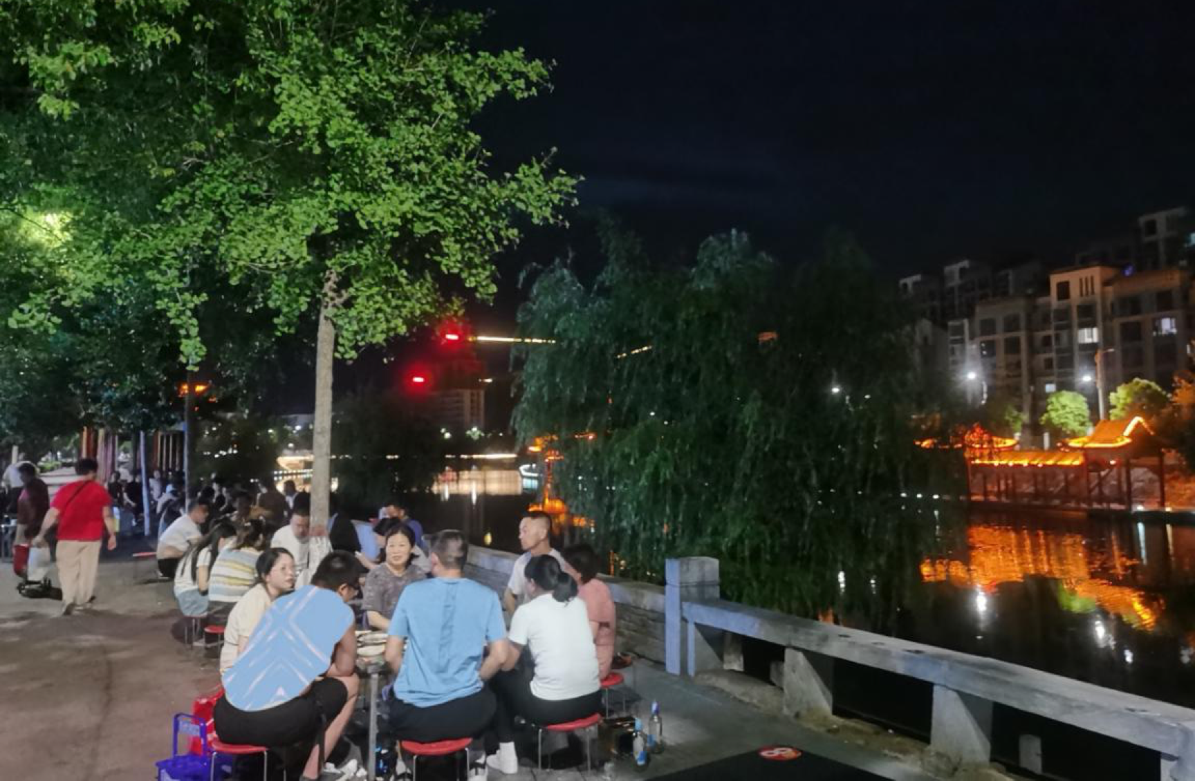 如马岩所言,只见对面河畔人头攒动、座无虚席,大家沐浴着轻柔的晚风,欣赏着汝河美丽夜景,时而谈笑风生,时而碰杯对酌,尽情畅享夏日夜晚的浪漫与惬意。