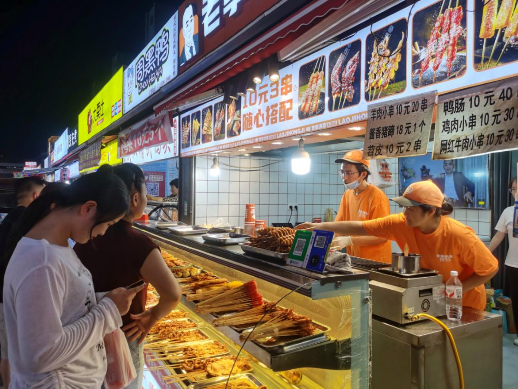在炎炎夏日,烤串、冷饮无疑是众多食客的心头好。商户雷师傅的烤串因为种类丰富、价格实惠,吸引了许多顾客。“在这里干三年多了,生意一直不错,每个月能收入5000元左右。七八月份可是旺季,学生都放假了,顾客越来越多,俺得加油干!”雷师傅一边翻着手里的烤串,一边乐呵呵地说。