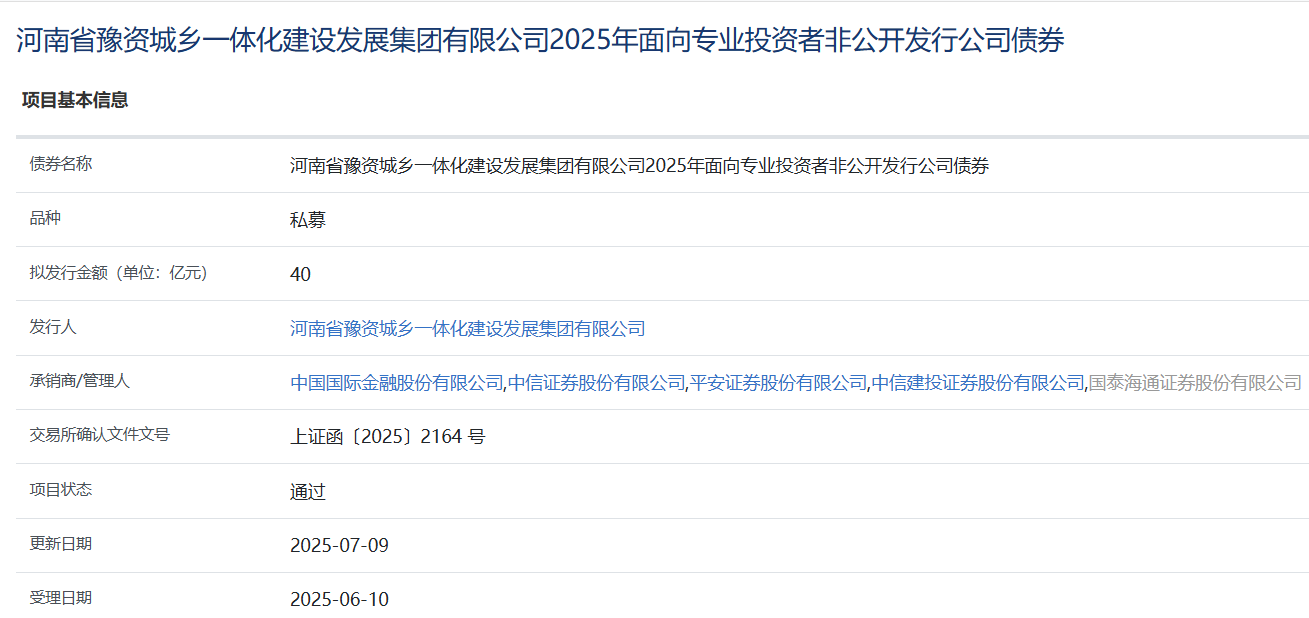 【大河财立方消息】7月9日,河南省豫资城乡一体化建设发展集团有限公司2025年面向专业投资者非公开发行公司债券项目获上交所通过。