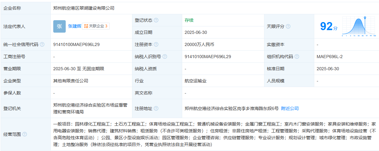 【大河财立方消息】天眼查APP显示,近日,郑州航空港区翠湖建设有限公司成立,法定代表人为张建辉,注册资本为2亿元,经营范围包含:园林绿化工程施工;土石方工程施工;体育场地设施工程施工;园区管理服务;供应链管理服务等。
