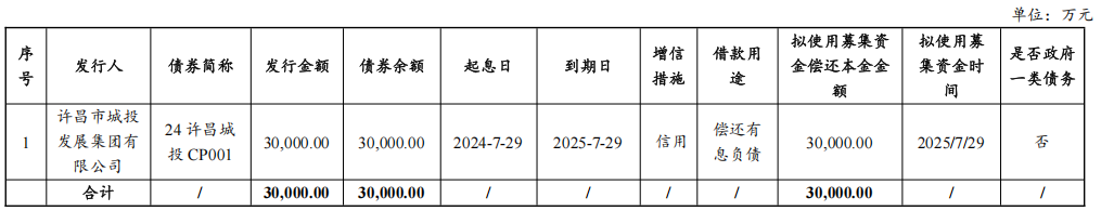 【大河财立方消息】7月9日,许昌市城投发展集团有限公司披露2025年度第一期短期融资券募集说明书。本期发行金额3亿元,期限1年。