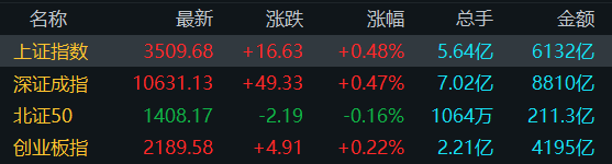 【大河财立方消息】7月10日,三大指数小幅上涨,沪指重回3500点上方,报收于3509.68点,涨0.48%,深成指涨0.47%,创业板指涨0.22%。全市场成交额15150亿元,较上日缩量124亿元。全市场超2900只个股上涨。