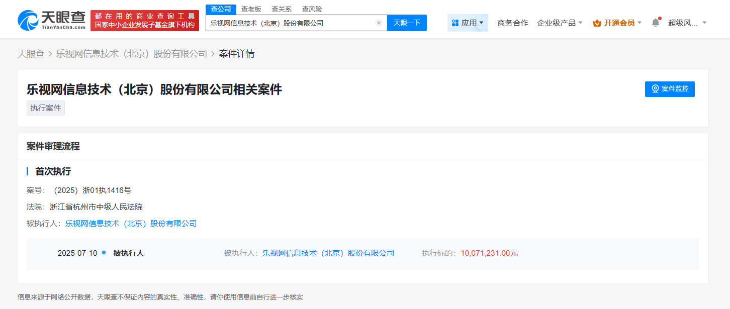 【大河财立方消息】天眼查深度风险信息显示,近日,乐视网信息技术(北京)股份有限公司新增1条被执行人信息,执行标的1007万余元,执行法院为浙江省杭州市中级人民法院。