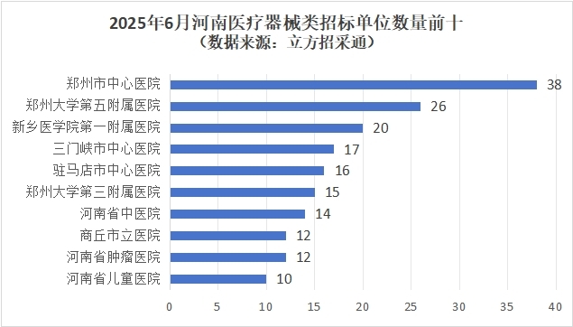 从招标单位看,数量上郑州市中心医院以38个位居榜首,其招标预算金额为2539.8万元,在本月河南医疗器械类招标单位预算总金额排名中居第14位。其次是郑州大学第五附属医院和新乡医学院第一附属医院,招标数量分别为26个和20个。
