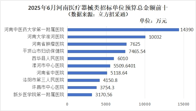 这是由于6月郑州市预算1000万元以上的大项目有11个,其中河南中医药大学第一附属医院高端影像设备采购项目预算金额超过5000万元。而在5月,郑州市预算金额最高的项目仅800万元。