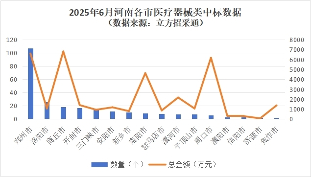 本月,招标项目数量与预算金额双双大幅攀升——招标项目环比上涨27.84%,招标预算总金额环比增加7.46亿元,达到11.46亿元,其中预算超千万元的项目达30个,两家医院的招标预算突破亿元大关。中标环节同样活跃,中标总金额达3.55亿元,商丘市以6647.9万元的中标总额超越郑州,领跑全省。