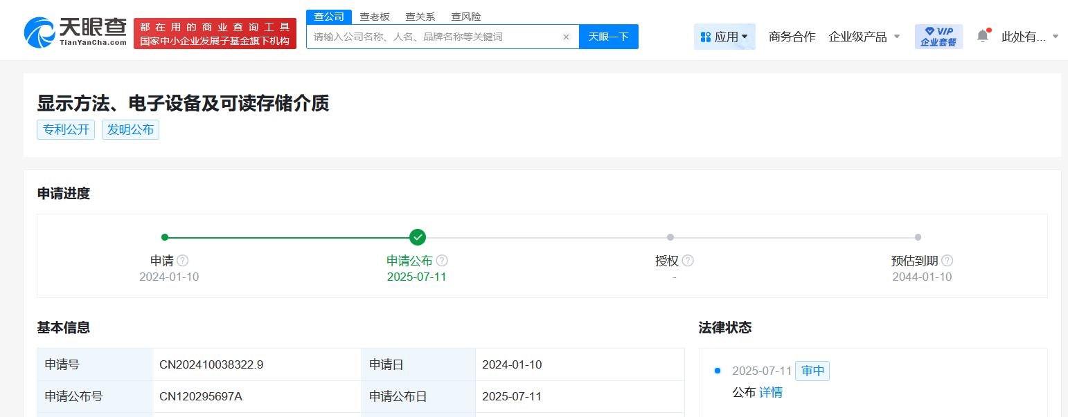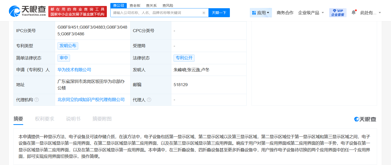 【大河财立方消息】天眼查财产线索信息显示,近日,华为技术有限公司申请的“显示方法、电子设备及可读存储介质”专利公布。