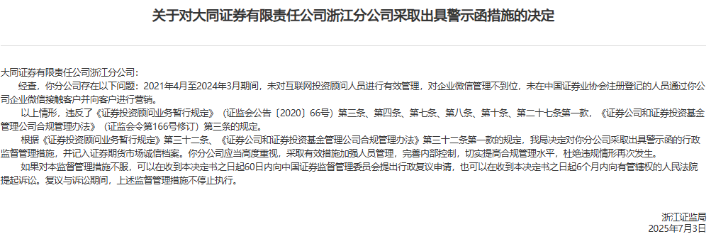 浙江证监局查明,大同证券浙江分公司在2021年4月至2024年3月期间,未对互联网投资顾问人员进行有效管理,对企业微信管理不到位,未在中国证券业协会注册登记的人员通过公司企业微信接触客户并向客户进行营销。