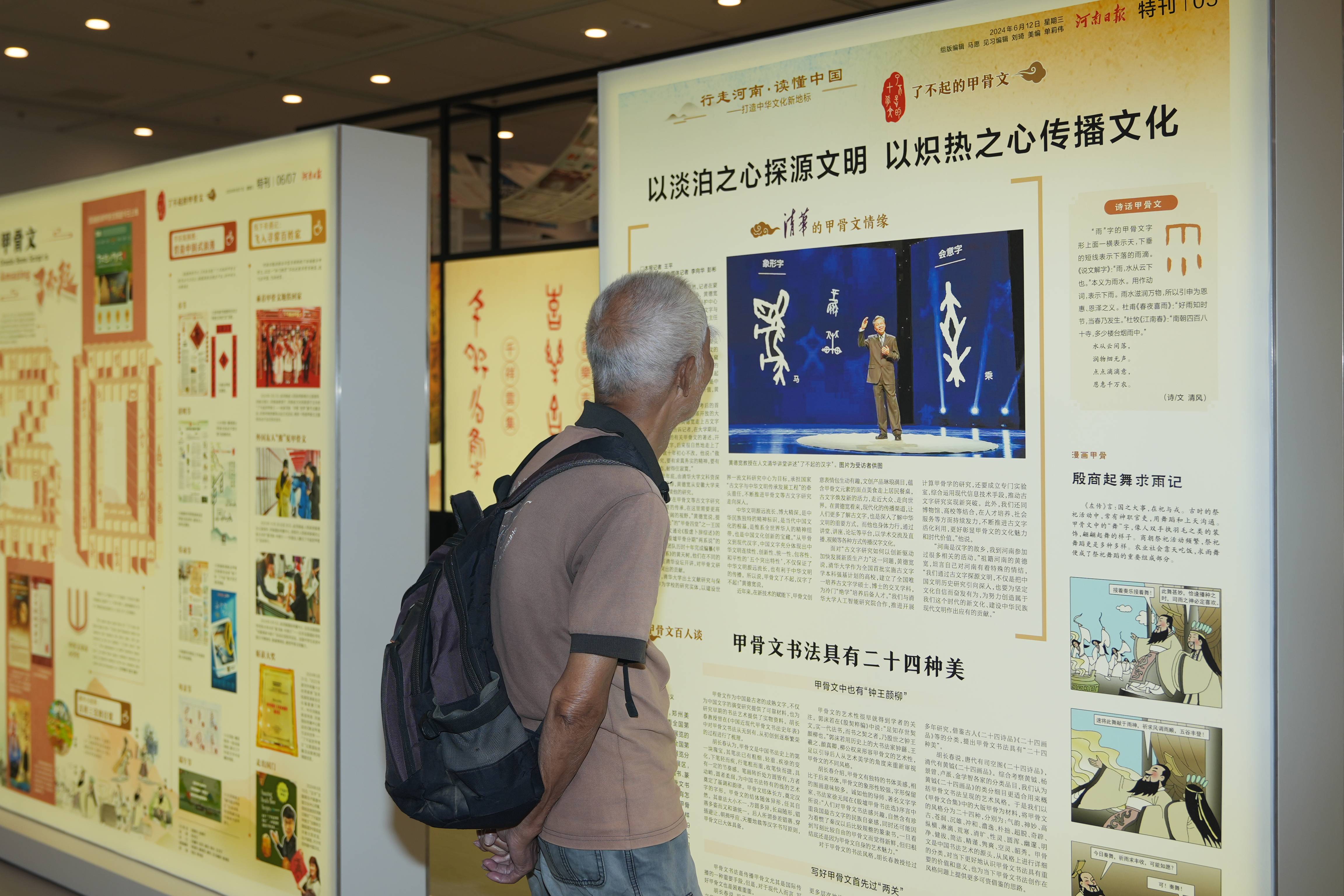 展览上,甲骨文还以各式各样的形态与大家相遇。展厅上方,60个河南日报“了不起的甲骨文”专题版面变成蜿蜒飘逸的帷幔,如同奔涌的文化热浪;甲骨文百家姓墙将甲骨文与现代汉字对照,大家兴致勃勃地翻看自己的姓氏,寻根溯源;60余种甲骨文主题文创琳琅满目、设计精美,涵盖明信片、丝巾、折扇、冰箱贴等,令不少观众爱不释手,把这份特别的记忆带回家……