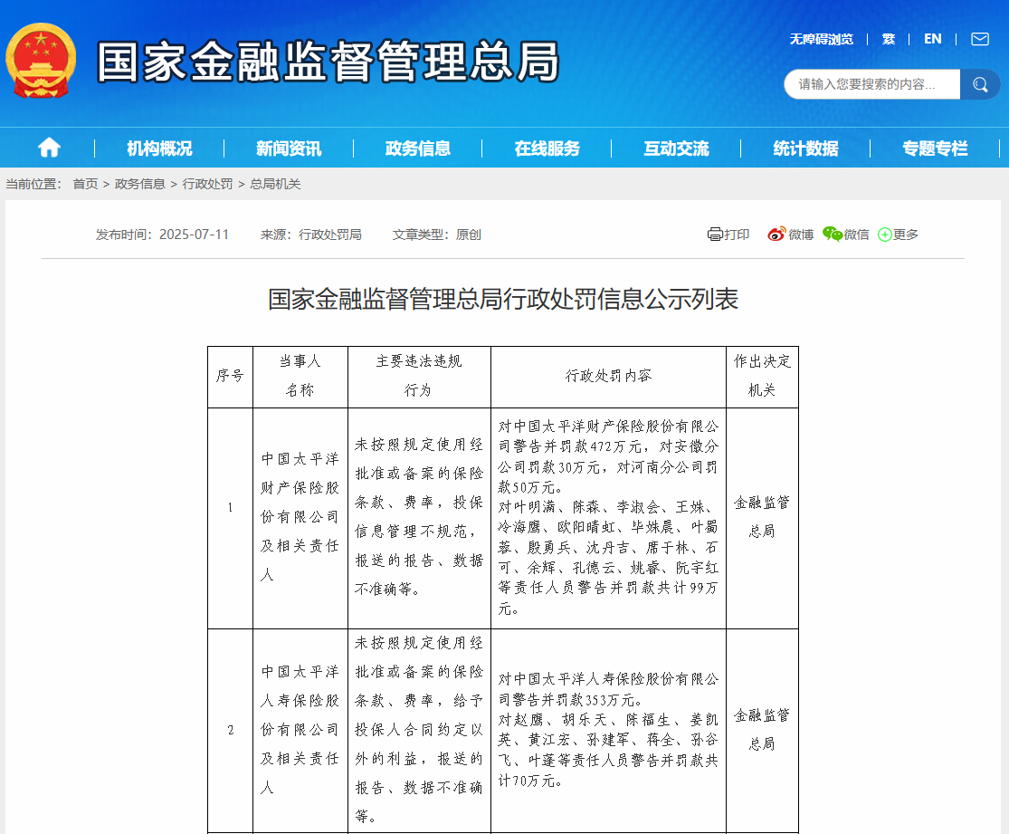 【大河财立方消息】7月11日,国家金融监督管理总局披露行政处罚信息,对中国太平洋保险集团旗下中国太平洋财产保险股份有限公司(简称:太保产险)、中国太平洋人寿保险股份有限公司(简称:太保寿险)及相关责任人开出1074万元巨额罚单。