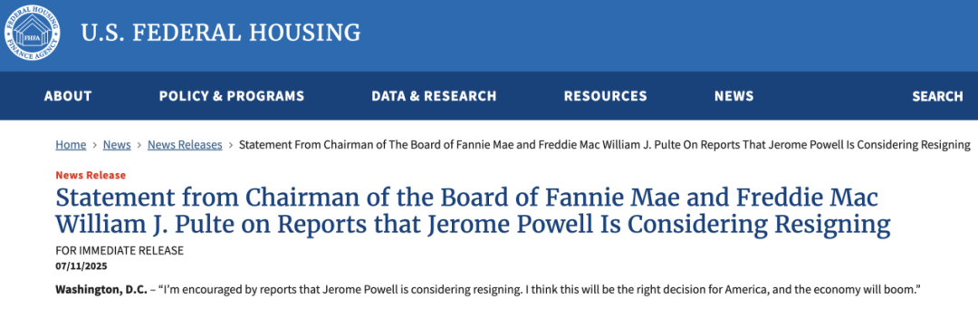 比尔·普尔特在美国联邦住房金融局 (FHFA)官网发表声明称:“有报道称杰罗姆·鲍威尔正在考虑辞职,这让我感到鼓舞。我认为这将是对美国的正确决定,经济将会繁荣。”