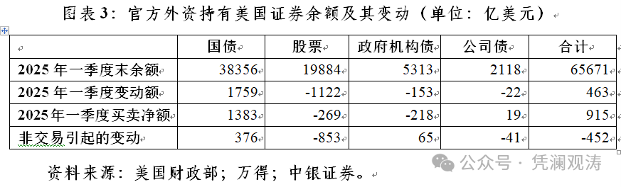 综上,截至今年一季度末,官方外资持有四大类美国证券余额合计65671亿美元,较上年末增加463亿美元。其中,净买入美国证券915亿美元,增长15.8%;非交易引起的官方外资持有美国证券余额减少453亿美元(见图表3)。