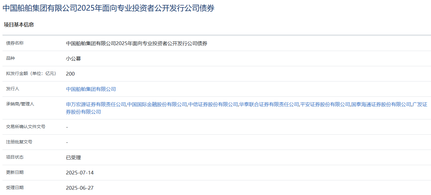 【大河财立方消息】7月14日,中国船舶集团有限公司2025年面向专业投资者公开发行公司债券项目已获上交所受理。