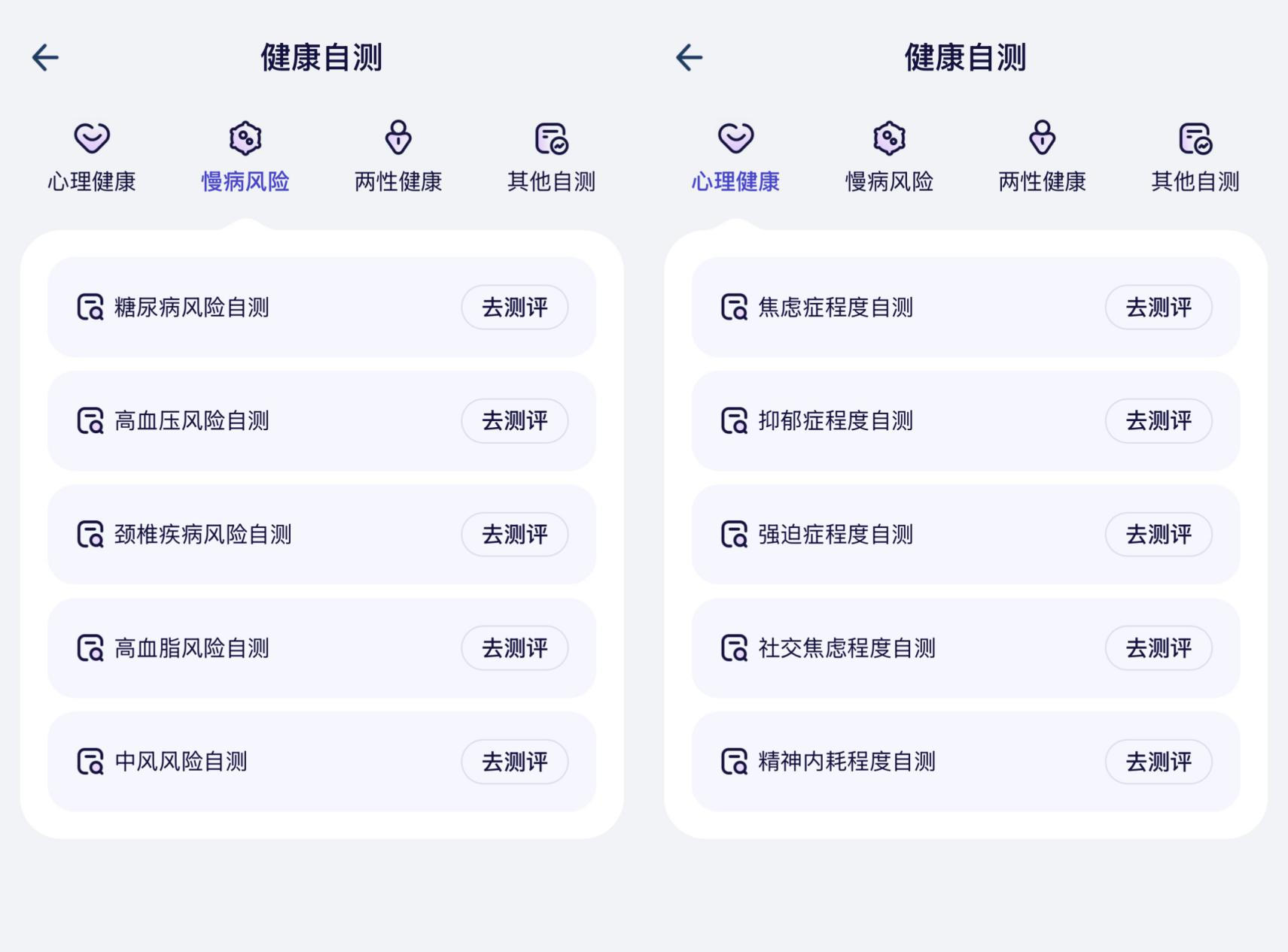 数据显示,中国慢性病患者规模呈上升趋势,中年人亚健康占比达75%,在AQ健康自测专区,用户还可进行高血压、高血脂、糖尿病、颈椎疾病等慢病风险自测,以及评估毛发健康状况与睡眠质量;同时,针对两性健康问题,AQ也提供了前列腺增生、产后抑郁、更年期生活质量等自测工具。