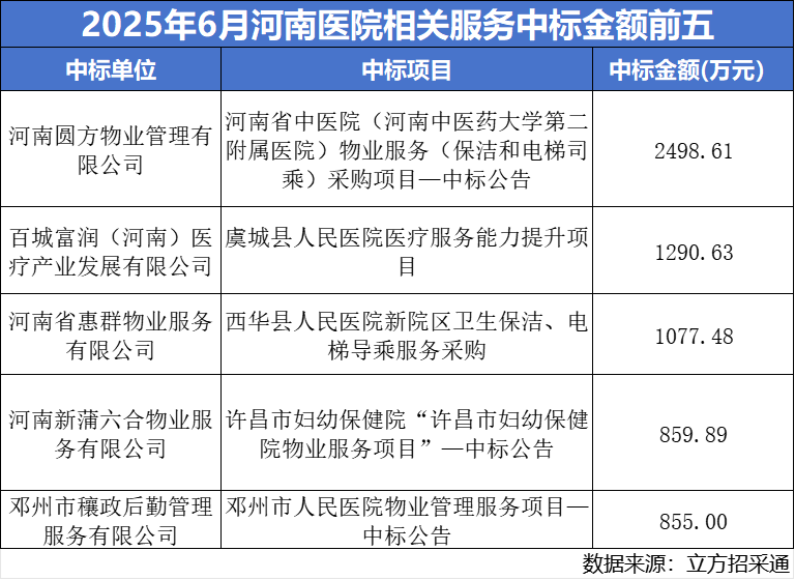 其中,河南圆方物业管理有限公司以2498.61万元中标河南省中医院(河南中医药大学第二附属医院)物业服务(保洁和电梯司乘)采购项目,主要负责该院院内卫生保洁、乘梯指引、公共区域和配套设施的环境卫生保洁等工作,服务期限为三年。这也是本月河南医院相关服务中标金额最高的项目。