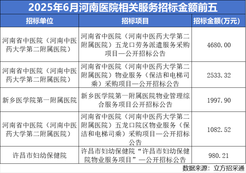 在6月份的医院相关服务采购市场中,千万级项目呈现明显的集中态势。根据立方招采通数据,本月四个千万级招标项目中,河南省中医院(河南中医药大学第二附属医院)独占三席,项目总金额8295.84万元。
