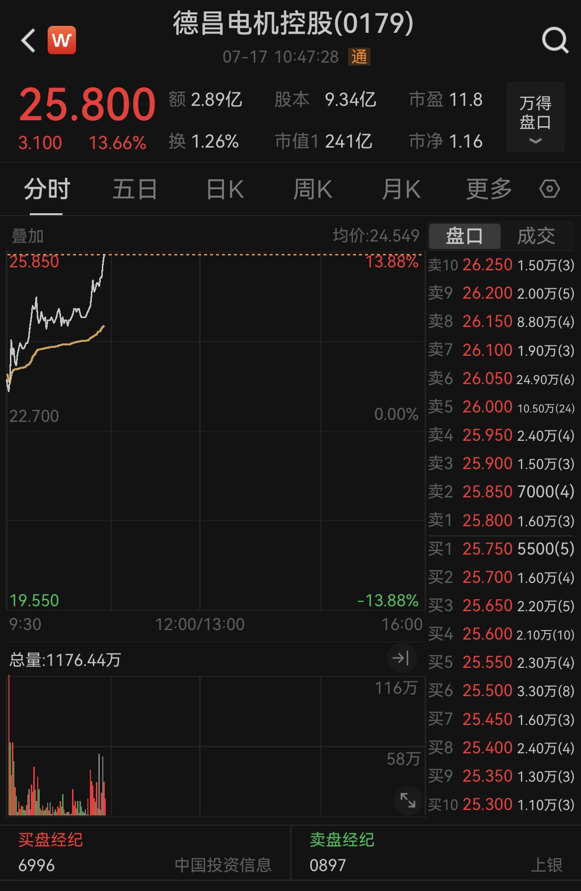 【大河财立方 见习记者 郑棋文】7月17日,德昌电机控股涨超13%,截至发稿,涨13.66%,报25.8港元,成交额2.83亿港元。