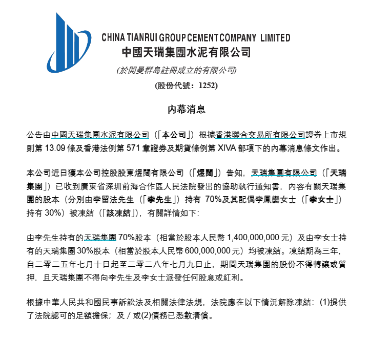 【大河财立方消息】7月20日,中国天瑞水泥在港交所公告,收到控股股东煜阔有限公司通知,李留法夫妇所持天瑞集团100%股份被深圳前海合作区人民法院司法冻结。冻结期为3年,自2025年7月10日至2028年7月9日,期间天瑞集团的股份不得转让或质押,且天瑞集团不得向李留法夫妇派发任何股息或红利。
