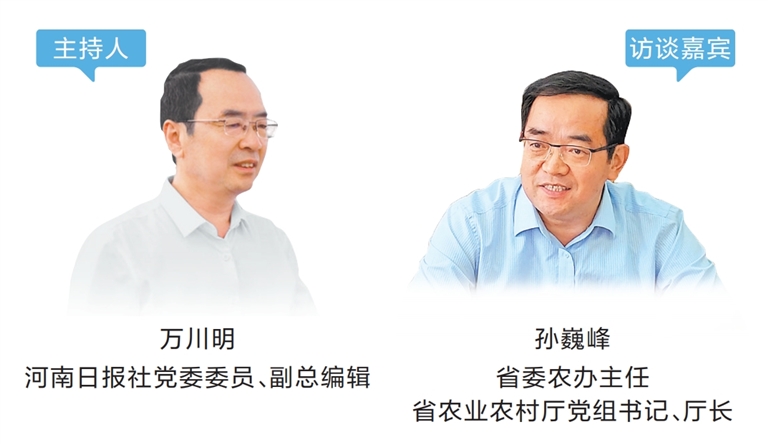 省委十一届九次全会对贯彻落实习近平总书记在河南考察时重要讲话精神进行系统部署,提出要奋力建设农业强省,抓好乡村全面振兴。本期“总编有约·‘两高四着力’大家谈”,邀请省委农办主任,省农业农村厅党组书记、厅长孙巍峰,与河南日报社党委委员、副总编辑万川明一起,围绕“抓好乡村全面振兴为农业强省建设提供支撑”这一话题进行交流。