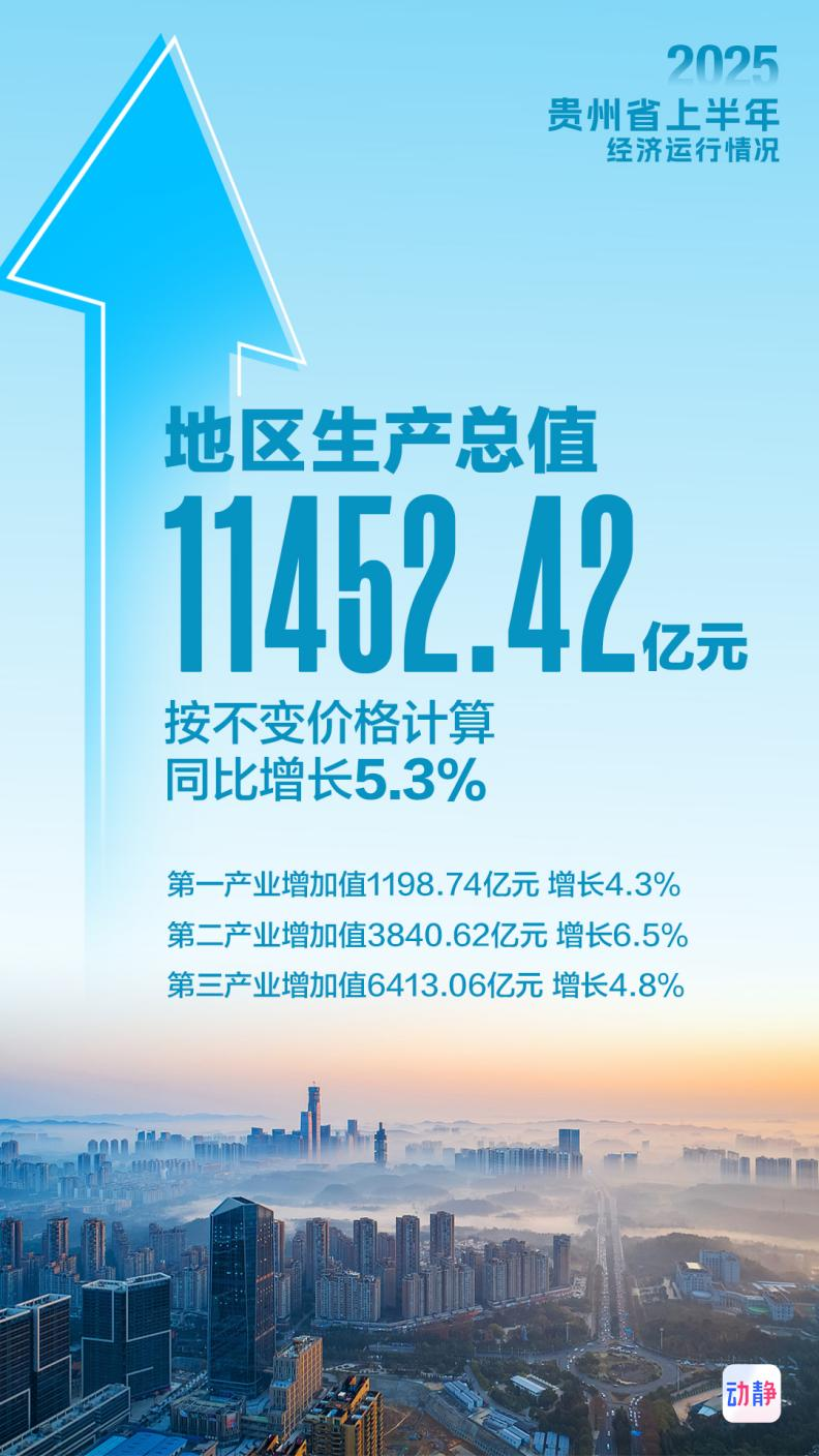 7月21日下午,贵州上半年经济数据发布,全省地区生产总值(GDP)超过1.1万亿元,同比增长5.3%。