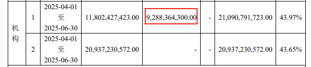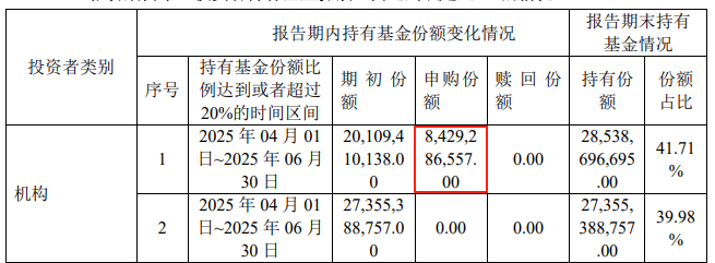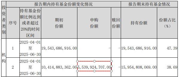 以市场最大规模的沪深300ETF华泰柏瑞沪深300ETF为例,二季报显示,报告期内单一投资者持有基金份额比例达到或超过20%的持有人“机构1”发生了申购行为,该机构期初份额为269.84亿份,期间申购份额为108.74亿份,报告期末持有份额达到378.58亿份。