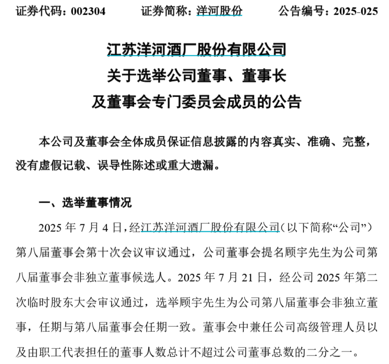 此前,7月4日,洋河股份董事会会议审议通过,提名顾宇为公司第八届董事会非独立董事候选人。7月21日,洋河股份临时股东大会审议通过,选举顾宇为公司第八届董事会非独立董事,任期与第八届董事会任期一致。