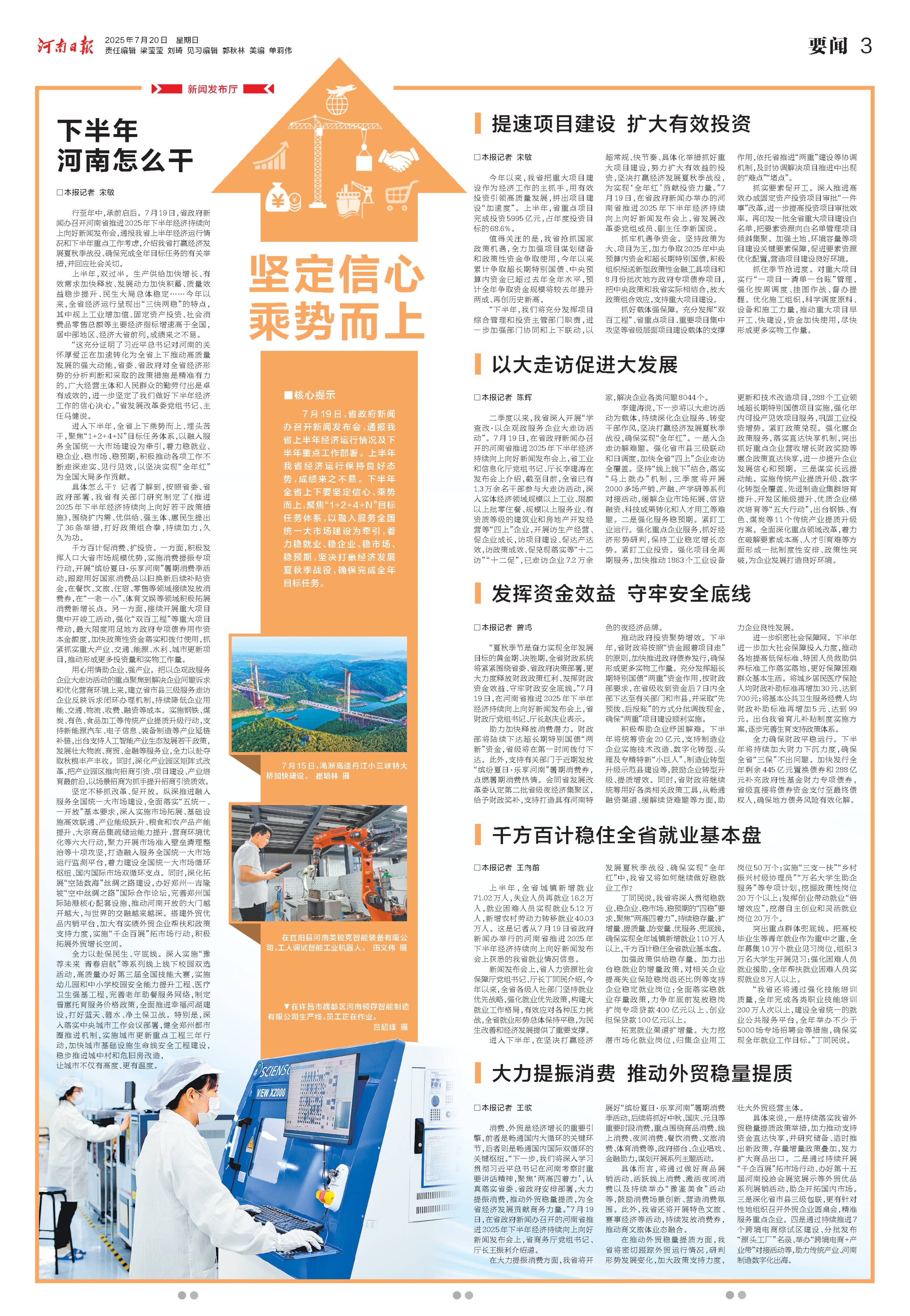 行至年中,承前启后。7月19日,省政府新闻办召开河南省推进2025年下半年经济持续向上向好新闻发布会,通报我省上半年经济运行情况和下半年重点工作考虑,介绍我省打赢经济发展夏秋季战役、确保完成全年目标任务的有关举措,并回应社会关切。