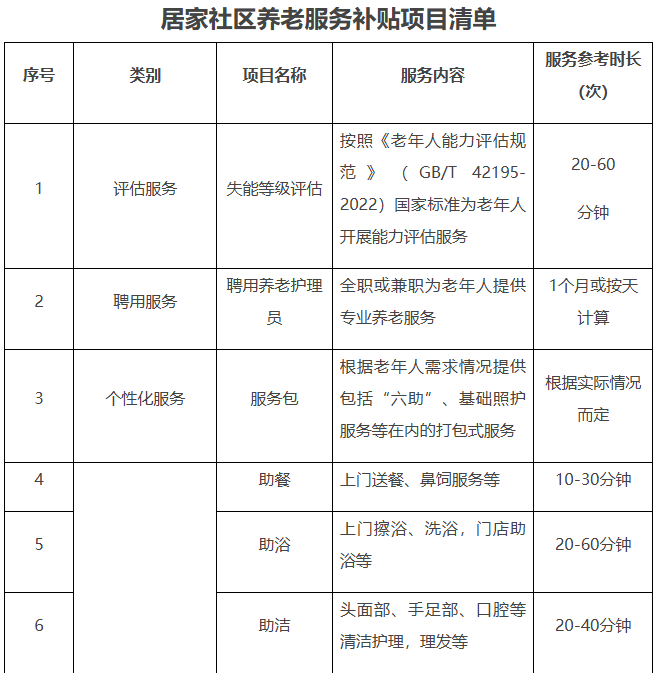 补贴项目包括居家、社区、机构养老服务。居家、社区养老服务主要包括助餐、助浴、助洁、助行、助急、助医服务,以及康复护理、日间托养等服务;机构养老服务包括长期服务(入住机构时间在30天以上)和短期服务(即“喘息服务”,入住机构时间在30天以内)等。其中,居家、社区养老服务补贴项目参见《居家社区养老服务补贴项目清单》(见附件),后续将根据实施情况对清单内容适时进行调整。各地针对上述补贴项目已有补贴政策的,应根据实际情况与本项目做好衔接。