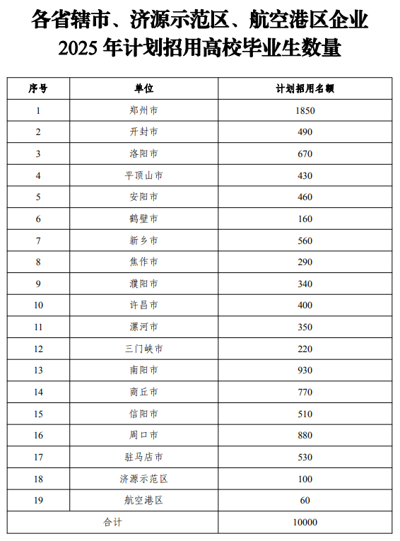 【大河财立方消息】7月23日,河南省工业和信息化厅、河南省人力资源和社会保障厅、河南省教育厅、河南省财政厅联合发布公布, 2025年,河南省计划组织企业面向社会招用1万名左右大学毕业生到企业就业,适度承担政策宣传、政企联络、营商环境观察等工作。