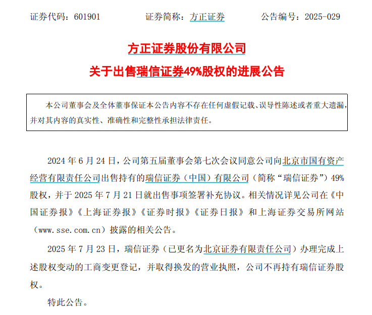 【大河财立方消息】7月23日,方正证券公告,瑞信证券完成股权变动的工商变更登记,公司不再持有瑞信证券股权。公告显示,瑞信证券已更名为北京证券有限责任公司。