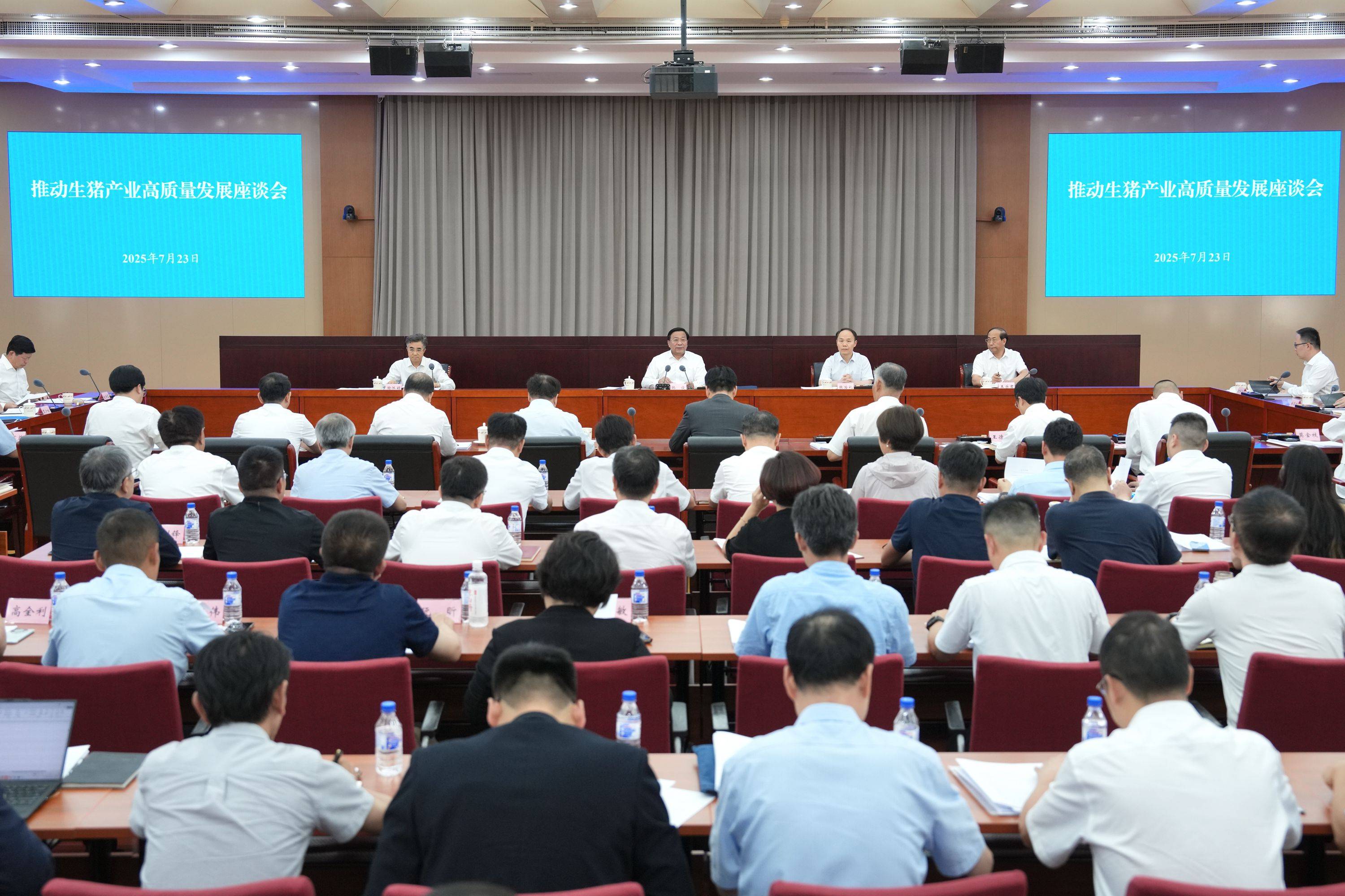 7月23日,农业农村部召开推动生猪产业高质量发展座谈会,部党组书记、部长韩俊主持会议并讲话。会议强调,要认真贯彻习近平总书记重要指示精神,落实党中央、国务院决策部署,进一步强化市场引导和政策支持,健全生猪产能综合调控机制,促进生猪市场稳定运行,加快推进生猪产业转型升级,推动生猪产业稳定健康发展。