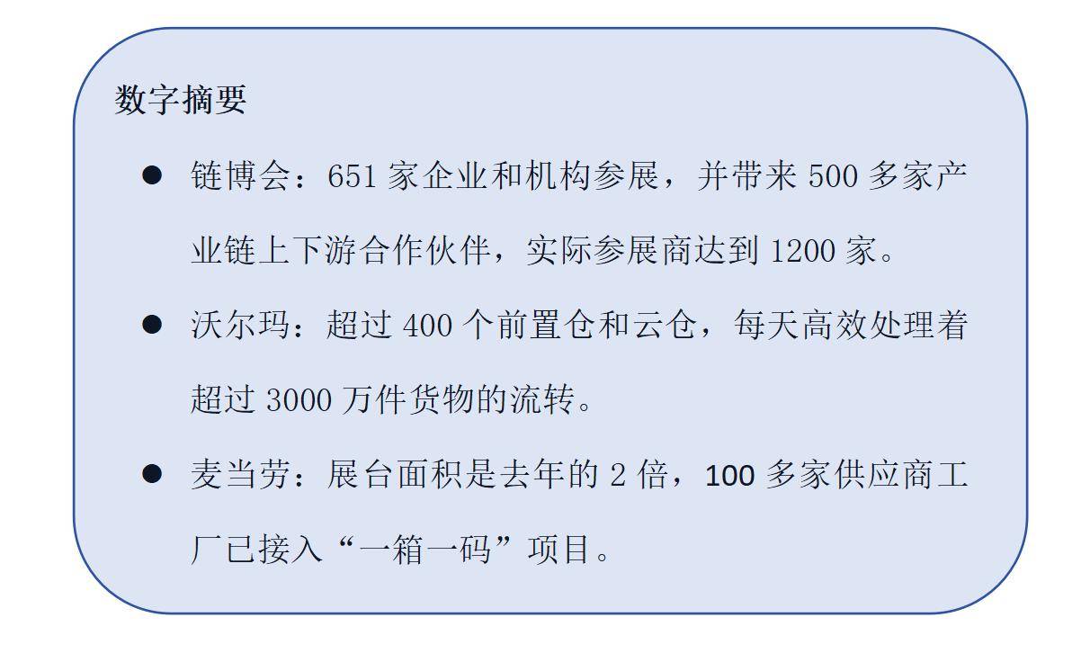 而大企业则可通过“敏捷+协同+可追溯”的数字闭环,为生产与物流提供即时需求信号,实现全链可视与追溯,凸显柔性供应链的“快”与“变”,进一步增强供应链韧性。例如,在本次链博会上,麦当劳中国发布其供应链智慧全链协同方案“一箱一码”2.0项目,让货品有了自己的“数字身份证”,增强了供应链上下游的数字化协同和精细管理能力,包括餐厅收货盘点效率提升30%以上,库存信息全链可视,赋能生产和物流环节实现更敏捷的需求和供应计划与管理。同时,货品管理的颗粒度从以批次为单位,精细到了每一箱货品,实现了货品信息全链可追溯,进一步保证食品安全。