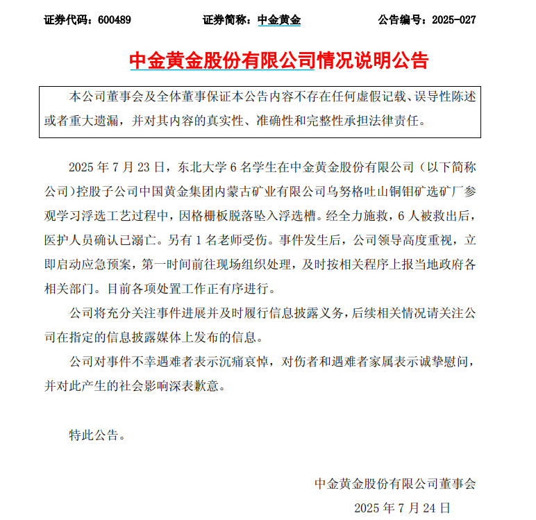 【大河财立方消息】7月24日早间,中金黄金发布情况说明,7月23日,东北大学6名学生在中金黄金控股子公司中国黄金集团内蒙古矿业有限公司乌努格吐山铜钼矿选矿厂参观学习浮选工艺过程中,因格栅板脱落坠入浮选槽。经全力施救,6人被救出后,医护人员确认已溺亡。另有1名老师受伤。事件发生后,中金黄金领导高度重视,立即启动应急预案,第一时间前往现场组织处理,及时按相关程序上报当地政府各相关部门。目前各项处置工作正有序进行。