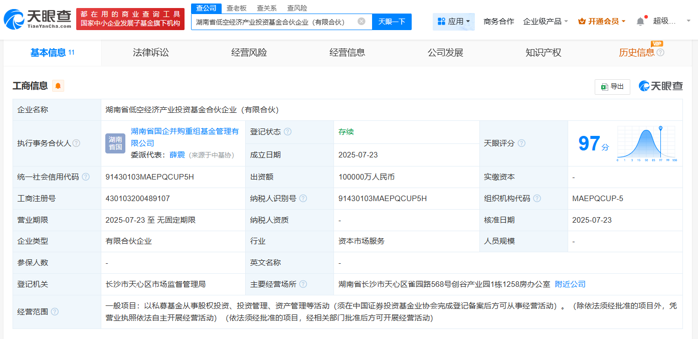 【大河财立方消息】7月24日消息,天眼查App显示,近日,湖南省低空经济产业投资基金合伙企业(有限合伙)成立,执行事务合伙人为湖南省国企并购重组基金管理有限公司,出资额10亿人民币,经营范围包括以私募基金从事股权投资、投资管理、资产管理等活动。