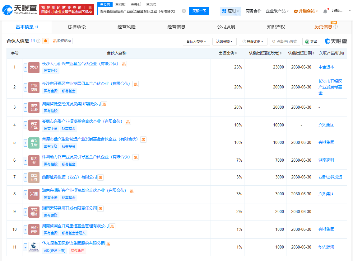 合伙人信息显示,该基金由长沙天心新兴产业基金合伙企业(有限合伙)、长沙市开福区产业发展母基金合伙企业(有限合伙)、湖南省低空经济发展集团有限公司等共同出资。