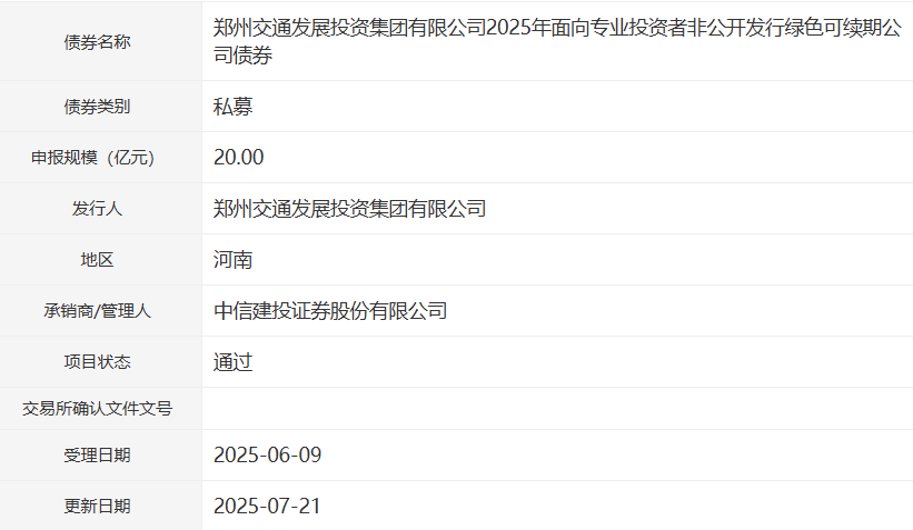 【大河财立方消息】7月24日消息,郑州交通发展投资集团有限公司2025年面向专业投资者非公开发行绿色可续期公司债券项目获深交所通过。债券拟发行金额20亿元,承销商/管理人为中信建投。2025年7月18日,经中诚信国际综合评定,发行人主体信用评级为AAA,展望稳定。