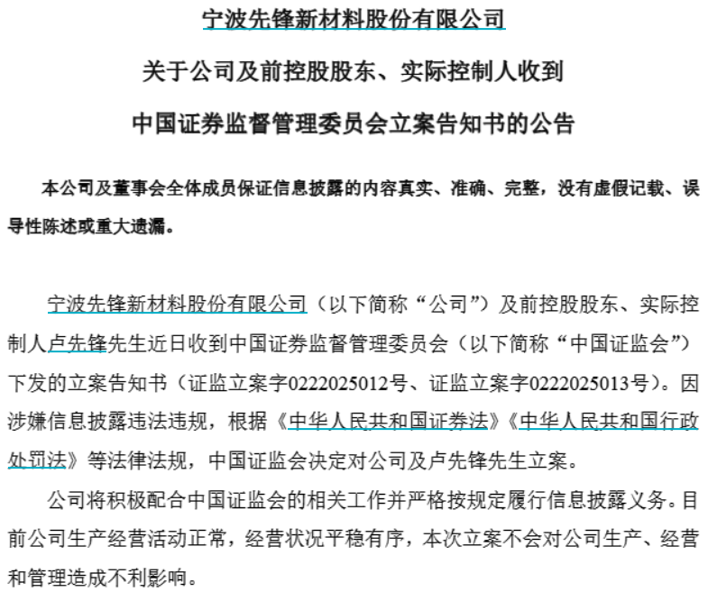 【大河财立方消息】7月24日,宁波先锋新材料股份有限公司(证券简称先锋新材)发布公告称,公司及前控股股东、实际控制人卢先锋近日收到中国证监会下发的立案告知书。因涉嫌信息披露违法违规,中国证监会决定对公司及卢先锋立案。