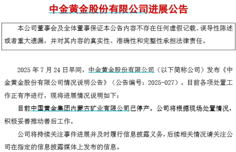 【大河财立方消息】7月24日,中金黄金股份有限公司(证券简称中金黄金)发布公告称,公司今日早间发布的《中金黄金股份有限公司情况说明公告》中提及的事件正在有序进行。目前中国黄金集团内蒙古矿业有限公司已停产。公司将根据现场处置情况,积极妥善推动善后工作。同时,中金黄金表示将持续关注事件进展并及时履行信息披露义务。