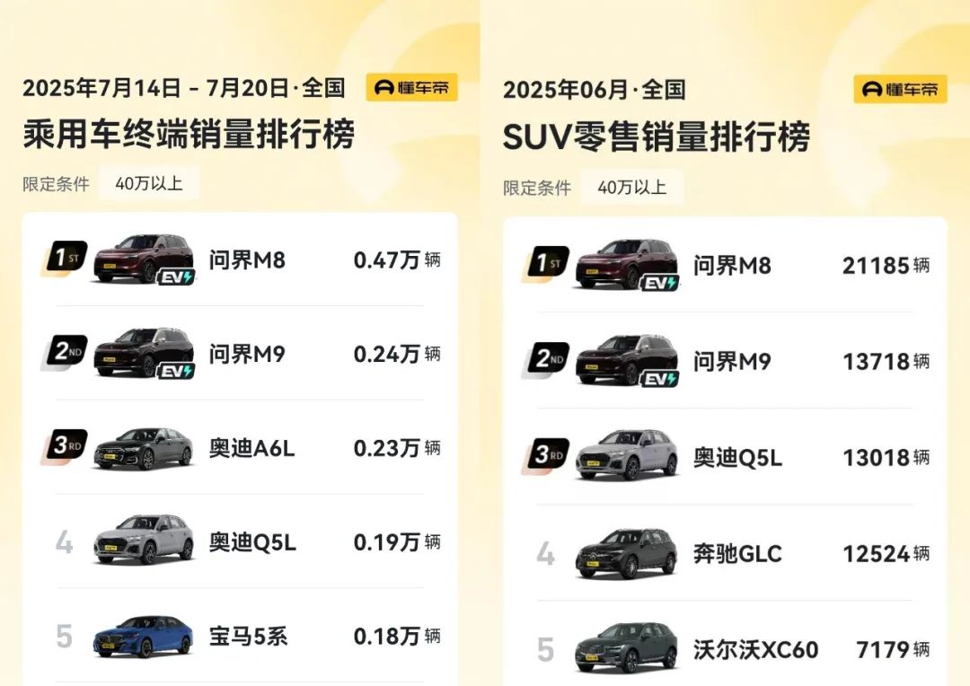 懂车帝公布的7月14日—7月20日周销量榜单显示,问界M8以4700辆的销量位居第一,已连续九周坐稳40万以上车型周销榜榜首,持续对“BBA”呈现碾压态势。