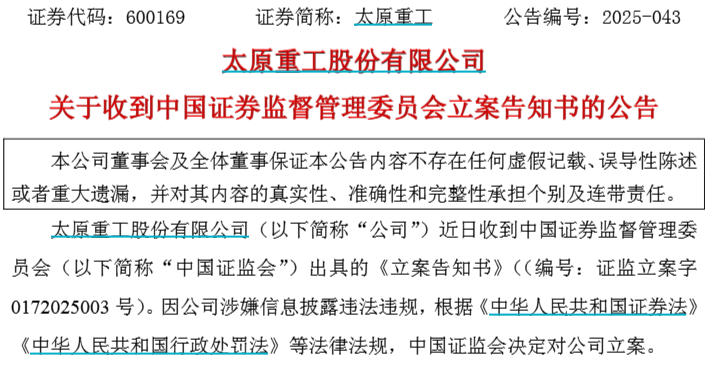 【大河财立方消息】7月25日晚间,太原重工股份有限公司(证券简称太原重工)发布公告称,近日收到中国证监会出具的立案告知书。因公司涉嫌信息披露违法违规,中国证监会决定对公司立案。