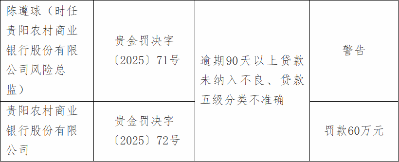 其中,因逾期90天以上贷款未纳入不良、贷款五级分类不准确,贵阳农村商业银行被罚60万元;时任该行风险总监被警告。
