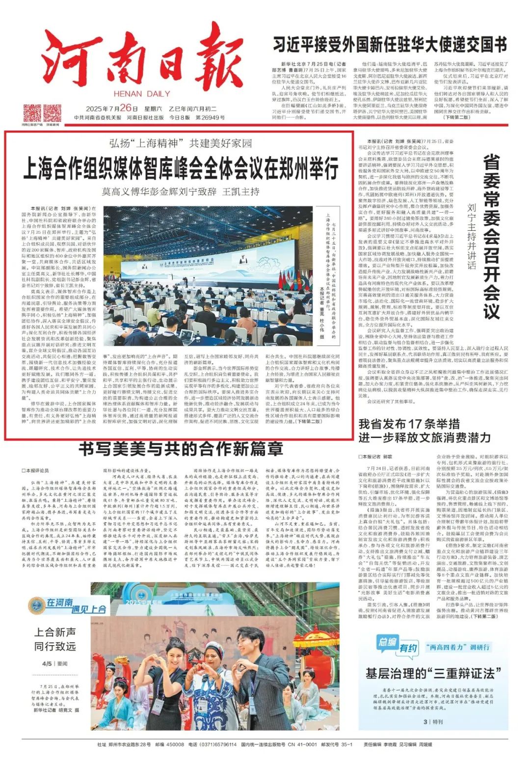 在国务院新闻办公室指导下,由新华社、中国社科院和省政府联合举办的上海合作组织媒体智库峰会全体会议7月25日在郑州举行,主题为“弘扬‘上海精神’ 共建美好家园”。来自上合组织成员国、观察员国、对话伙伴的近200家媒体、智库、政府机构及国际和地区组织的400余位中外嘉宾齐聚一堂,共商媒体合作,共话区域发展。中宣部副部长、国务院新闻办公室主任莫高义,新华社社长傅华,中国社科院副院长、党组副书记彭金辉,省委书记刘宁致辞,省长王凯主持。