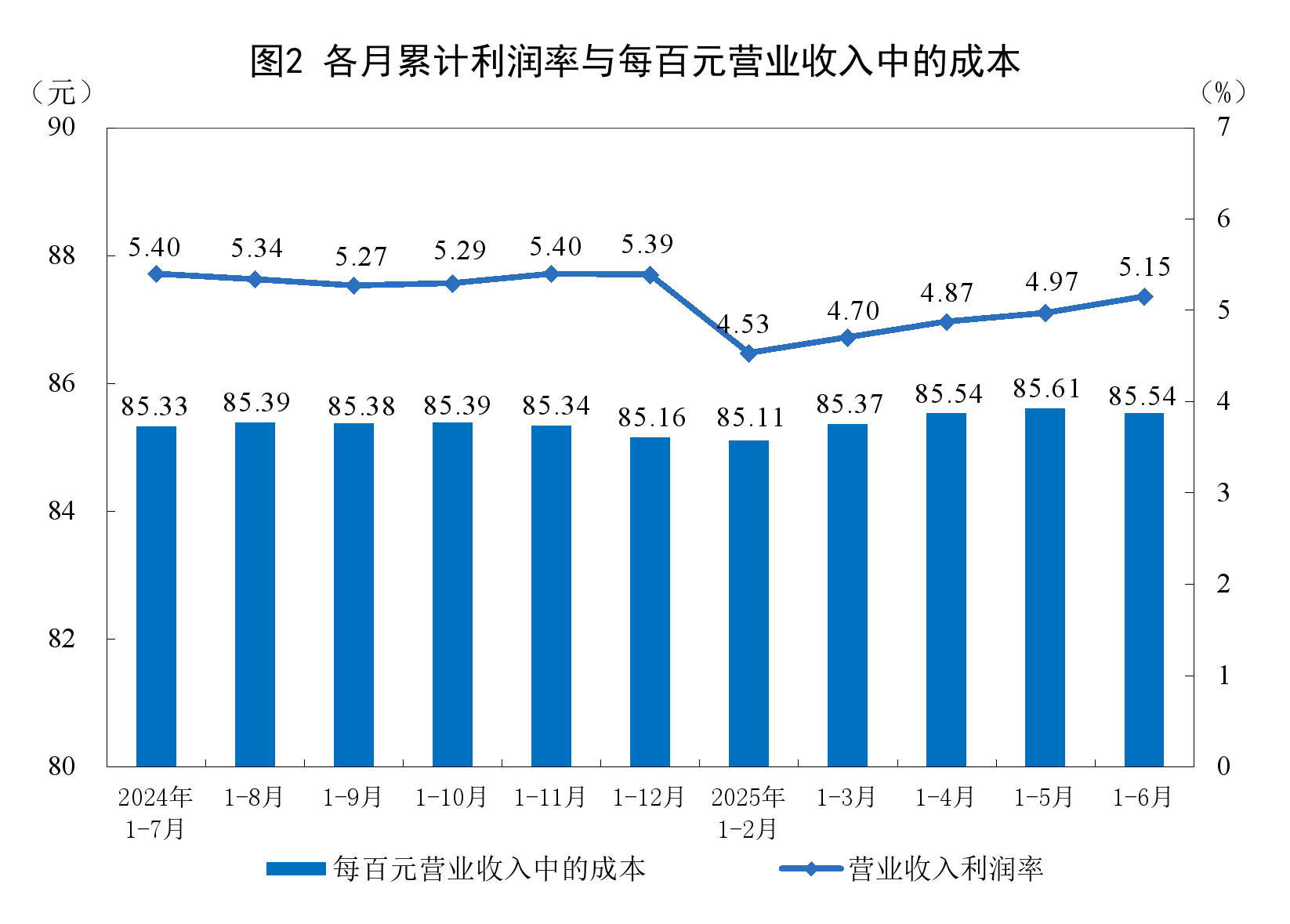 1—6月份,规模以上工业企业每百元营业收入中的成本为85.54元,同比增加0.26元;每百元营业收入中的费用为8.38元,同比减少0.10元。