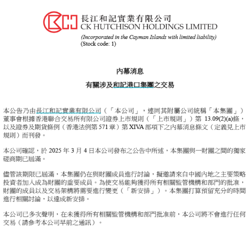 长和确认,于2025年3月4日本公司发布之公告中所述,本集团与一财团之间的独家磋商期已届满。