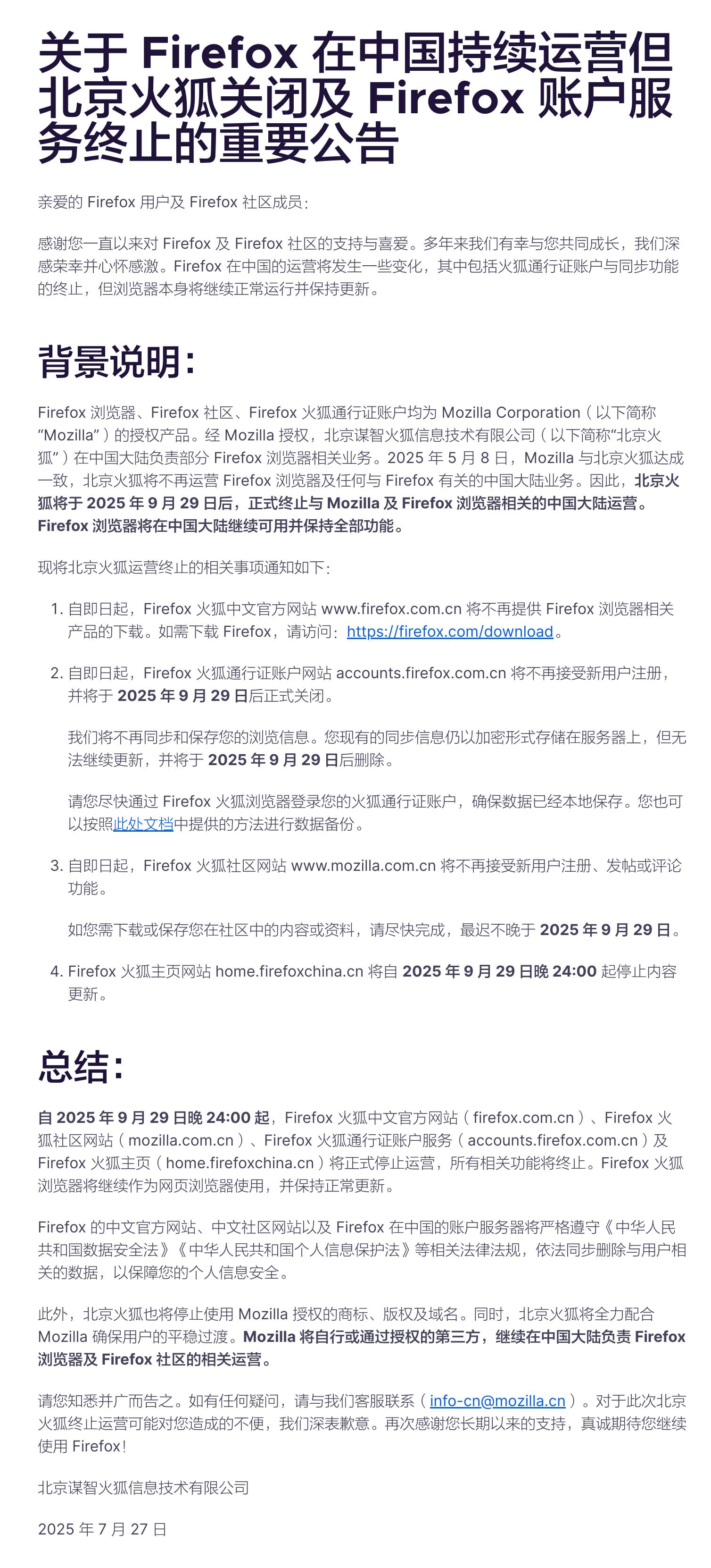 据了解,Firefox浏览器、Firefox社区、Firefox火狐通行证账户均为Mozilla的授权产品。经Mozilla授权,北京火狐在中国大陆负责部分Firefox浏览器相关业务。2025年5月8日,Mozilla与北京火狐达成一致,北京火狐将不再运营Firefox浏览器及任何与Firefox有关的中国大陆业务。因此,北京火狐将于2025年9月29日后,正式终止与Mozilla及Firefox浏览器相关的中国大陆运营。Firefox浏览器将在中国大陆继续可用并保持全部功能。