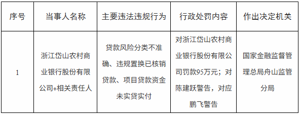 【大河财立方消息】7月29日,国家金融监督管理总局舟山监管分局披露的行政处罚信息显示,因贷款风险分类不准确、违规置换已核销贷款、项目贷款资金未实贷实付,浙江岱山农村商业银行被罚95万元,陈建跃、应鹏飞被警告。