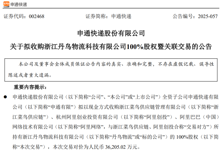 【大河财立方 记者 丁洋涛 文图】快递物流江湖再掀波澜,申通不甘当前行业排位,欲收购丹鸟物流补齐高端快递板块,实现弯道超车。7月25日晚,申通快递发布公告,公司拟以3.62亿元收购浙江菜鸟供应链、阿里创投、阿里网络持有的丹鸟物流100%股权。公告显示,此次收购,申通快递将战略性切入高端市场,有望加快推进品质快递网络体系的铺设和优化升级。当下,国家邮政局鼓励快递企业开展兼并重组,申通这一收购动作,或可助力其重回行业前三。