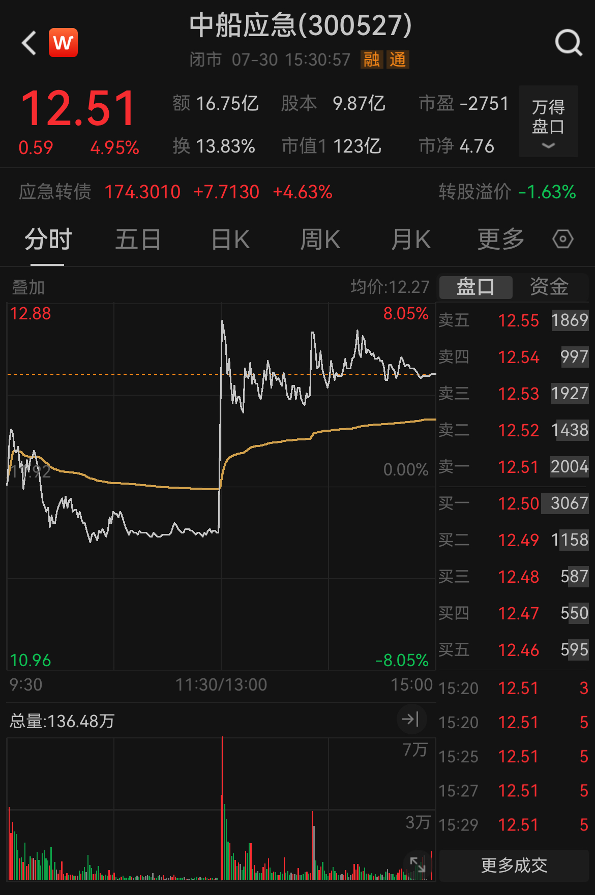 截至7月30日收盘,中船应急报12.51元/股,市值123亿元。