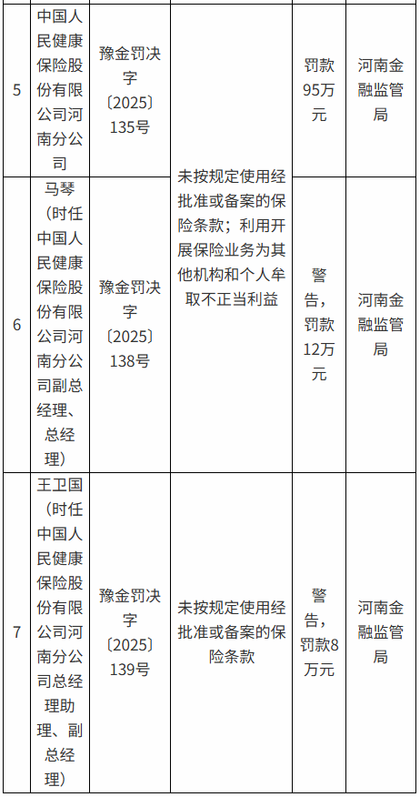 时任中国人民健康保险股份有限公司河南分公司副总经理、总经理马琴因未按规定使用经批准或备案的保险条款,利用开展保险业务为其他机构和个人牟取不正当利益,受到警告,并罚款12万元。